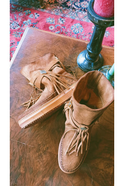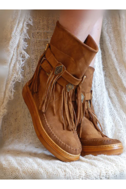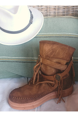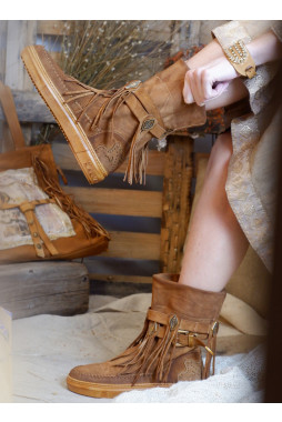 ♥ Bohemian laarsje met een sneaker zool, bandjes met dull gold studs en gesp op de schacht en franjes aan de zijkanten.