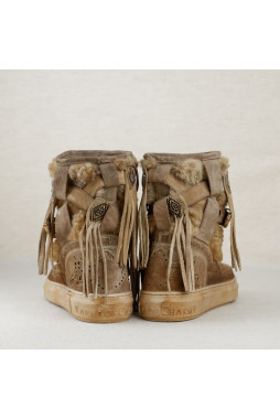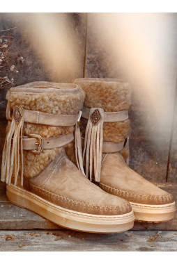 ♥ Bohemian laars met bont aan de buitenkant en een sneaker zool en bewerkte bandjes. Gespen op de schacht en boho franjes aan de zijkanten.