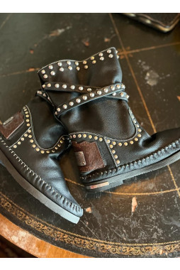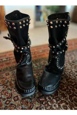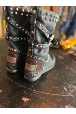 Stoere halfhoge laars met biker details zoals studs en riempjes.