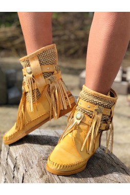 ♥ Middelhoge leren schoen met riemen, studs en franjes aan de zijkant♥ Kleur is geel♥ Lente / zomer♥ Italiaanse handgemaakt♥ Goed om te weten 1: de gouden plaat met het Karma of Charme-logo is flexibel, je kunt het aanpassen zoals je wilt♥ Goed om te weten 2: er zit een 3,5 centimeter hak in deze Karma-schoen