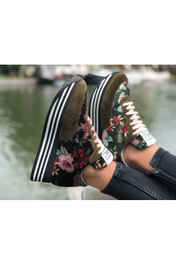 De sneaker heeft licht roze veters en een hoge plateau zool. De sneaker zit confortabel en is mooi afgewerkt met een bloemenprint.